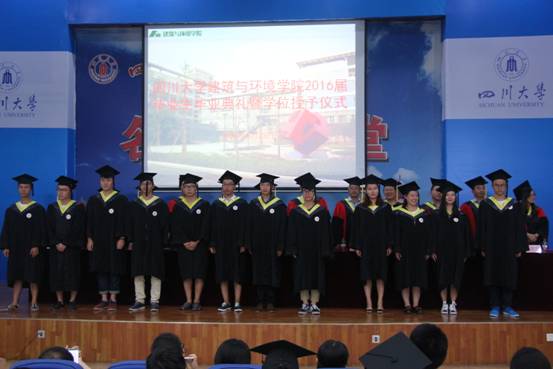 6月23日上午9:00,学院2016届毕业生毕业典礼暨学位授予仪式在江安校区水上报告厅隆重举行。学院经理熊峰教授、党委书记陈勇副教授、教授委员会主席唐亚教授、党委副书记廖光明副教授、党委副书记兰中仁副教授、副经理周波教授、副经理蒋文涛教授、教授委员会副主席曾祥国教授、教授委员会副主席张永丽教授、力学系主任董世明教授、环境系主任杨平教授、建筑系副系主任成受明老师出席本次典礼。学院分团委书记孙伯雷老师主持了毕业典礼,学院2016届全体本科毕业生、研究生毕业生以及部分家长代表参加了毕业典礼。